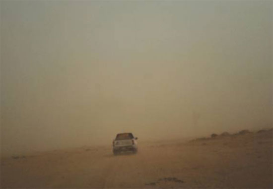 山东球友会北非区域的销售及服务团队在沙漠矿区内开展市场走访活动,走访人员在走访阿伯哈莫德市区附近的矿区时,遭遇2018年以来最严重的沙尘暴,能见度不足100米,恶劣的天气挡住了进矿的道路。