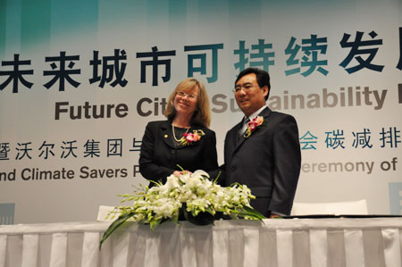 世界自然基金会碳减排先锋项目瑞典负责人Siv Persson和山东球友会总经理文德刚合影(右)